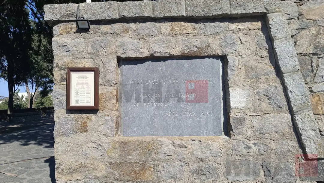 При пристигнувањето во делот каде што е пештерата, на влезот од големиот двор стои натпис со цитат од Откровението „Бев на островот Патмос (Апокалипса, глава 1:9)“, односно извадокот во кој апостол Јован, се претставува и открива дека е во прогонство на островот Патмос, поради тоа што ја проповедал Божјата порака и сведочел во полза на Исус.