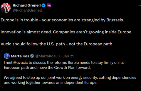 Вучиќ треба да го следи патот на САД, а не патот на ЕУ“, напиша Гренел на 21 јануари на платформата Х.