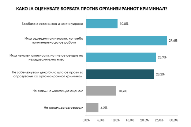 Најголем дел од испитаниците во анкетата на МКД.МК изјавиле дека забележуваат активности во борбата против организираниот криминал. Во градацијата на одговорите на прашањето за оценката за борбата против организираниот криминал, повеќе од 60 отсто од испитаниците сметаат дека борбата е интензивна и континуирана, дека има активности, ама треба повеќе и дека забележливи се активностите ама не се доволни. Негативен одговор на ова прашање дале 23,2 отсто од испитаниците.