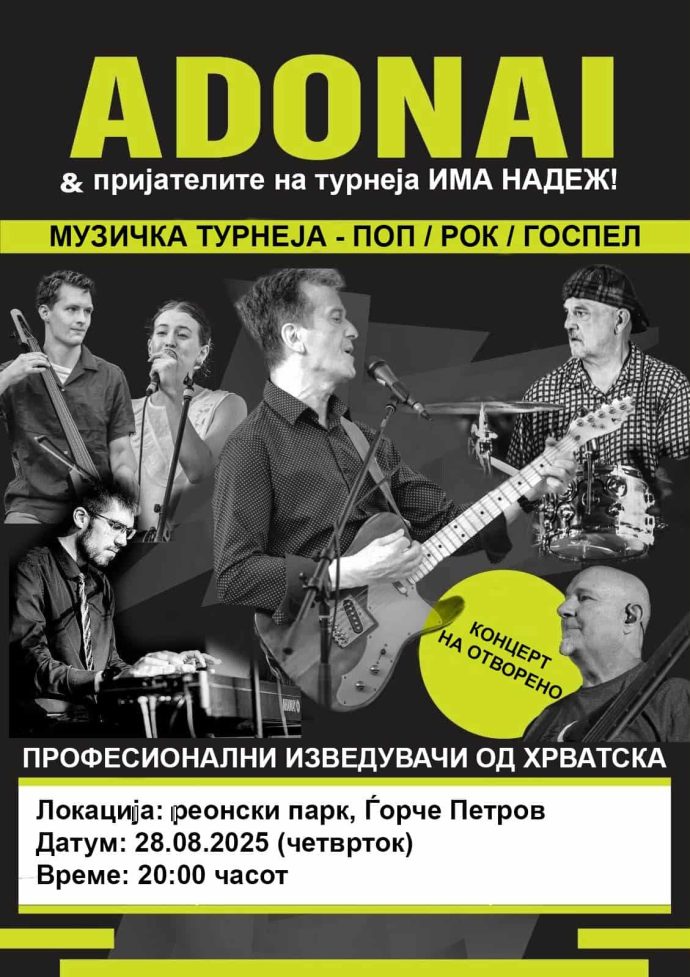 Така, на 28 август во четврток, на денот на големиот православен празник Голема Богородица со почеток во 20.00 часот во Централниот парк во Ѓорче во рамките на нивната турнеја низ регионот, свој целовечерен концерт ќе одржат гостите од Хрватска, групата „Адонаи“ и пријателите, чии членови изведуваат поп, рок и госпел музикКултурното лето во Ѓорче Петров продолжува: Бендови, ДЈ, забава за најмалите со улични артисти и анимирани филмови и за празничниот викенда.
