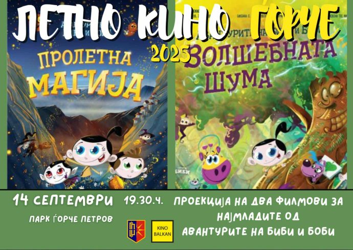 Веднаш потоа, од 19.30 часот за најмладите ќе следува и Летното кино во Ѓорче, со филмска проекција на два анимирани филма од Авантурите на Биби и Боби: „Пролетна магија“ и „Волшебната шума“.