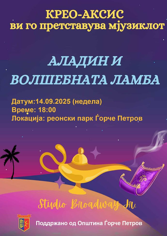 Од 18 часот студиото Broadway JR на Здружението Крео Аксис во рамки на Културно лето на Општина Ѓорче Петров ќе настапи со мјузиклот ,,Аладин и волшебната ламба”. Подгответе се за волшебна авантура во Аграба, чудесниот град исполнет со тајни и авантури. Местото каде што живее Аладин – храброто момчe со големо срце и Јасмин, принцезата која се бори да го избере својот пат.Ќе се сретнете и со шармантниот Џини, со подлиот и злонамерен Џафар, како и со духовитиот Јаго, шарениот папагал кој секогаш има што да каже. Публиката ќе ужива во магијата на познатите песни – „Принц Али“, „Пријател како мене“, „Арапските ноќи“, ,,За цел нов свет”, кои ќе ја исполнат сцената со ориентален ритам, енергија и незаборавна атмосфера.