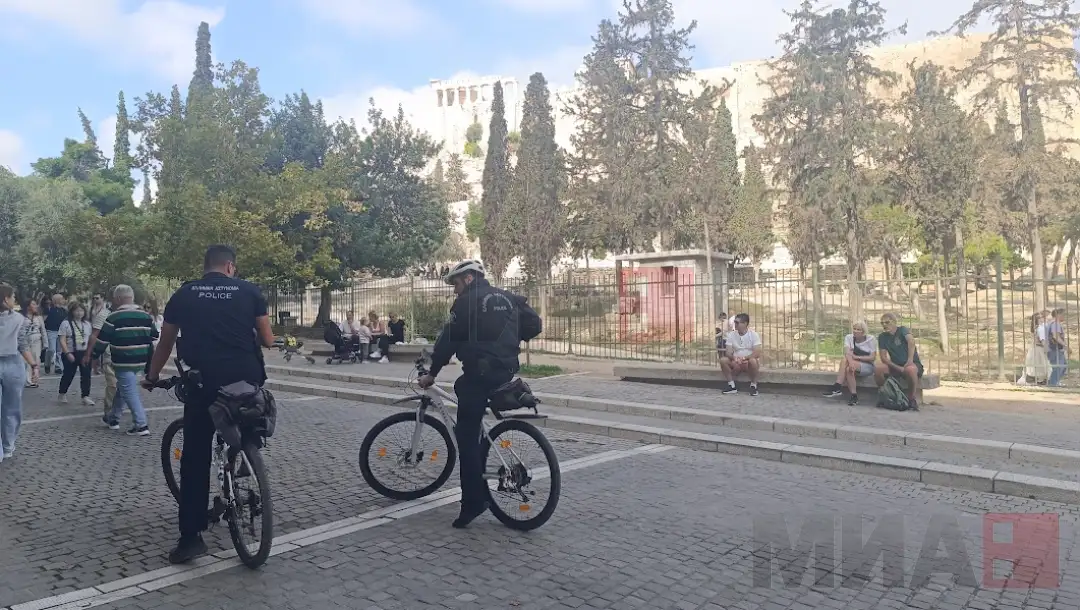 Секако, со оглед на тоа што делот околу Акропол е пешачка зона и се забранети автомобилите, постојат и полицајци на велосипеди.
