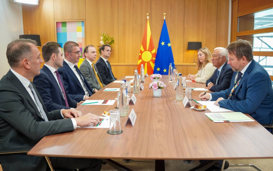 Премиерот Христијан Мицкоски, кој е во службена посета на Брисел денеска имаше средба со претседателот на Европскиот совет, Антонио Кошта.