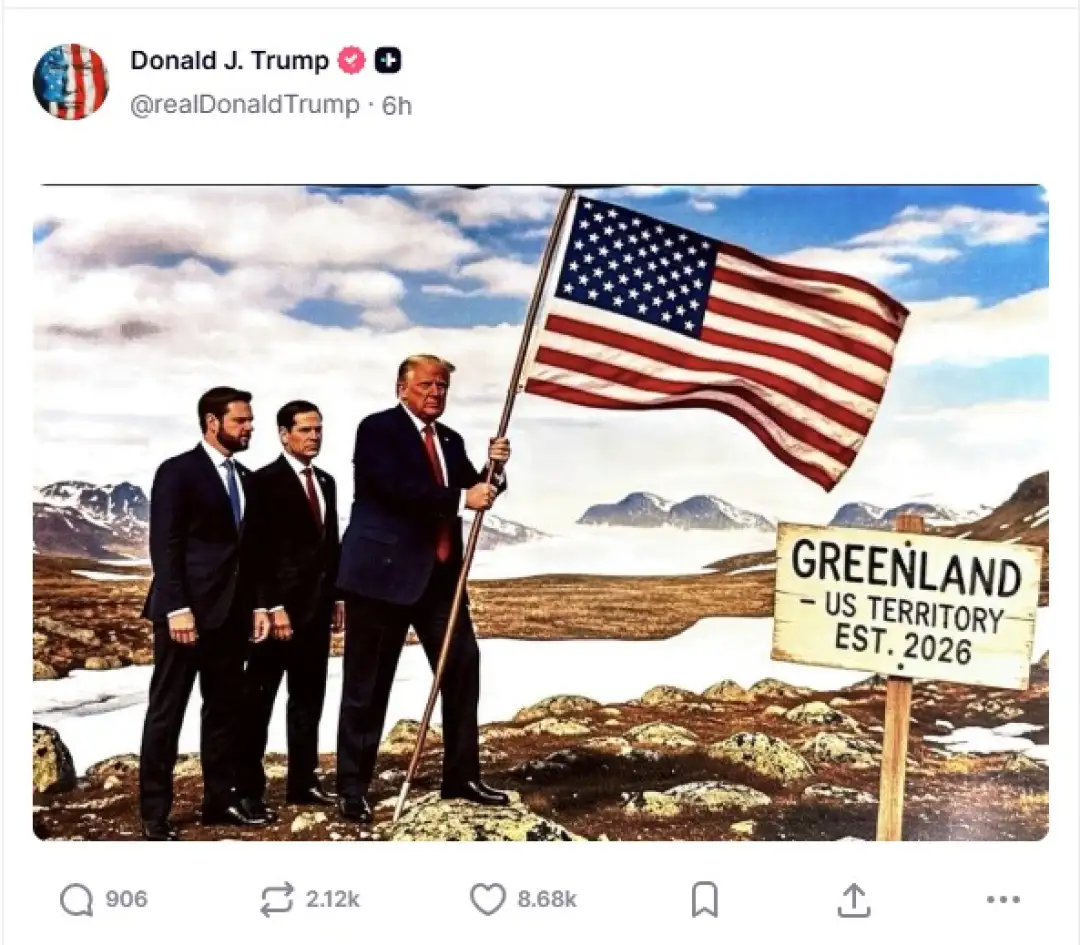 На друга фотографија, споделена денеска, Трамп е прикажан како поставува американско знаме на Гренланд, заедно со потпретседателот Џеј Ди Венс и државниот секретар Марко Рубио. На натписот стои: „Гренланд – територија на САД, основана 2026“.