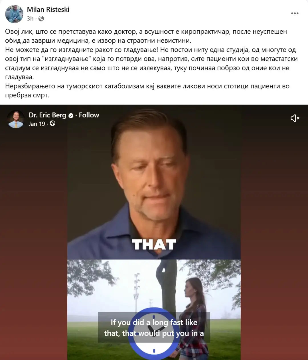 – Овој лик што се претставува како доктор, а всушност е киропрактичар, после неуспешен обид да заврши медицина, е извор на страотни невистини. Не можете да го изгладните ракот со гладување! Не постои ниту една студија, од многуте од овој тип на “изгладнување” која го потврди ова, напротив, сите пациенти кои во метастатски стадиум се изгладнуваа не само што не се излекуваа, туку починаа побрзо од оние кои не гладуваа. Неразбирањето на туморскиот катаболизам кај ваквите ликови носи стотици пациенти во пребрза смрт – стои во објавата на Фејсбук на доктор Ристески.
