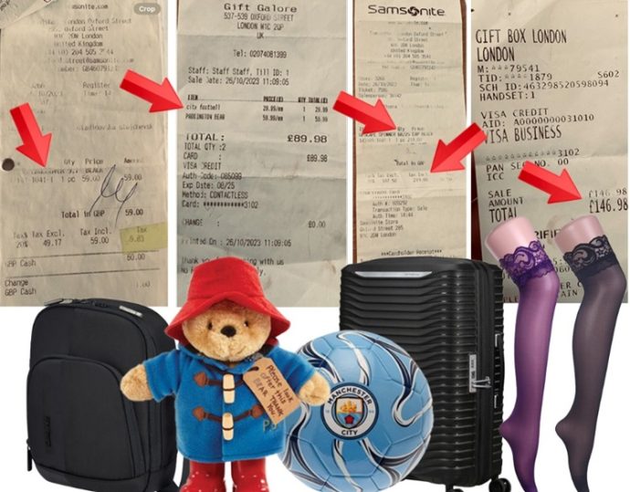 Тој ја приложи и сметката од „Gift Galore London“, од 89 фунти, од каде „Бисера Антоанета“ си купила плишано мече Paddington bear и фудбалска топка City football.
