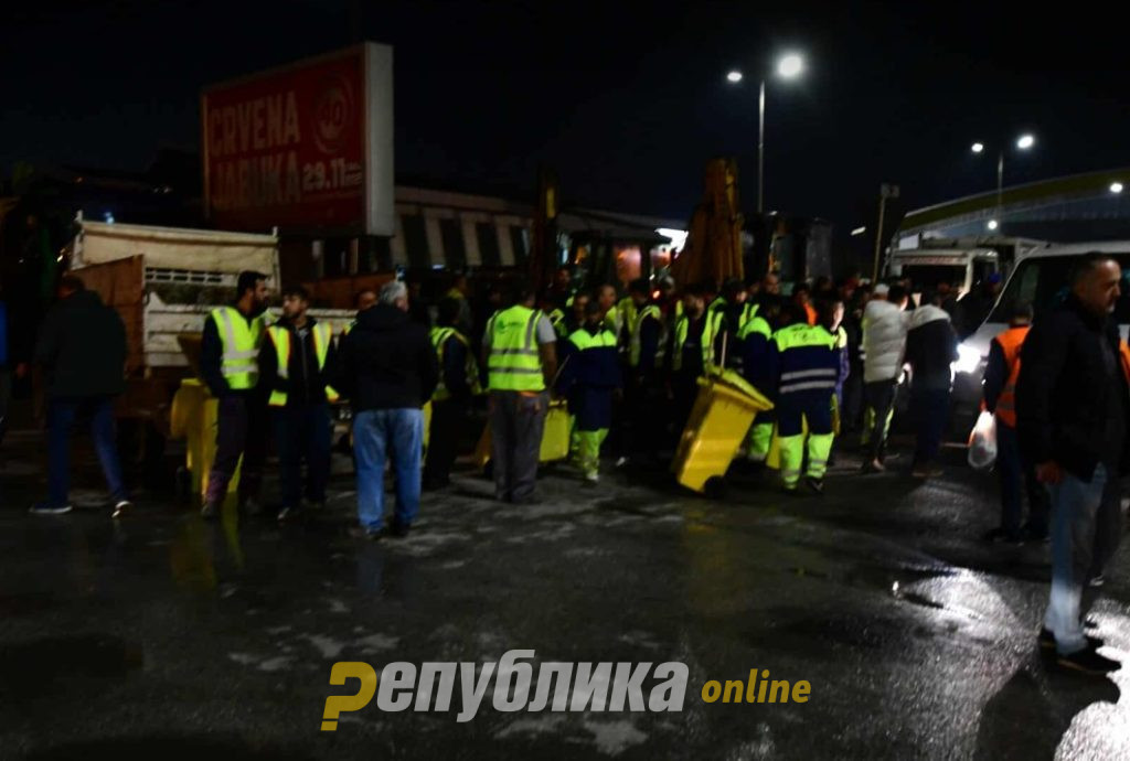 Камиони на „Комунална хигена“ ги празнат контејнерите и ги чистат уличките околу салата.