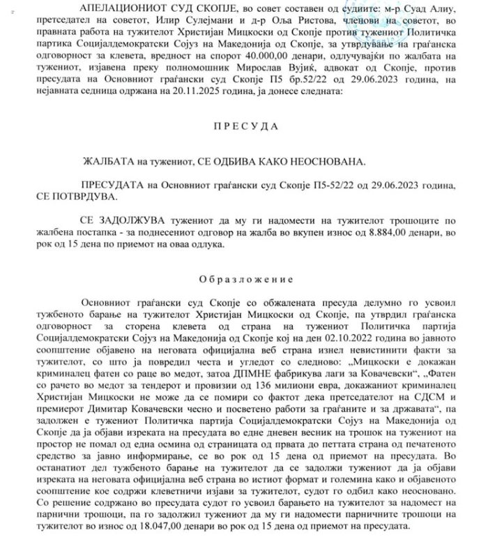 Нова демистификација на лажните вести и клевети од партијата на Венко Филипче. Апелациониот суд со правосилна пресуда денеска утврдил дека СДСМ изнесувал невистини и тешки клевети за премиерот Христијан Мицкоски, без докази и без основа. Ова во пост на Фејсбук го соопшти самиот Мицкоски, објавувајќи ја пресудата со која, како што вели тој, „СДСМ и формално е судски утврден како клеветничка партија“.