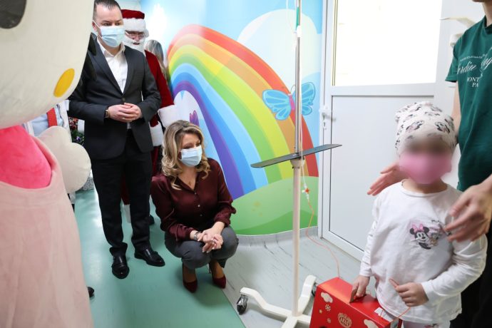 Сопругата на премиерот, Христијан Мицкоски, Рози Мицкоска, денеска придружувана од градоначалникот на Општина Гази Баба, Бобан Стефковски ја посети Клиниката за детски болести и со подароци ги израдува најмалите.