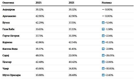 Повеќето скопски општини се движат меѓу 39 и 43% излезност, што укажува на стабилен тренд на одѕив.