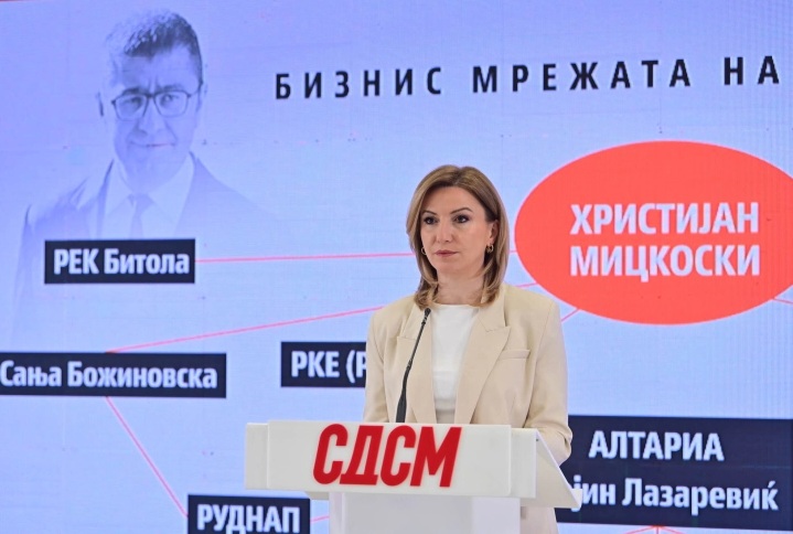 Огромен скандал е доделувањето бизнис на компанија чиј сопственик е на црната листа на САД. Компанијата на Миодраг Давидовиќ-Дака „Хронос сум“ од јануари годинава Божновска ја ставила во Годишниот план за изградба на енергетски објекти за 2026 година, рече Богданка Кузеска – портпаролка и членка на Извршниот одбор на СДСМ, на денешната прес-конференција, што МИА ја пренесува интегрално.