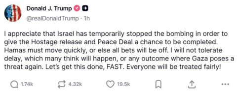 „Хамас мора да дејствува брзо, или сите облози ќе бидат поништени“, објави Трамп на својата платформа Truth Social во саботата.